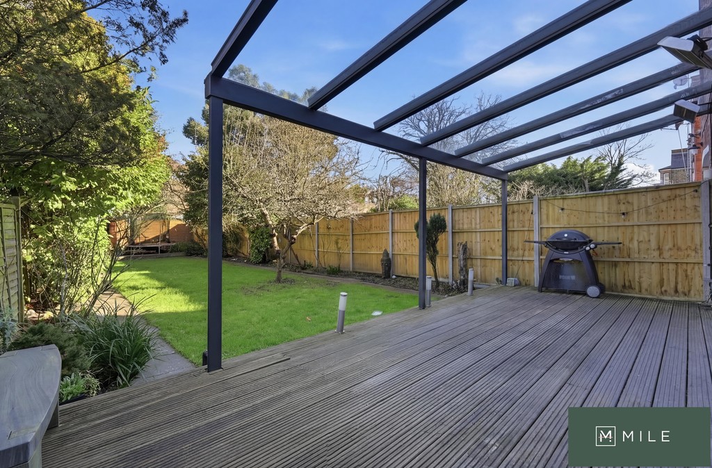 To the rear, a landscaped garden with decking and a covered structure creates an excellent space for outdoor dining and socialising. The property further benefits from extensive built-in storage and additional eaves storage.