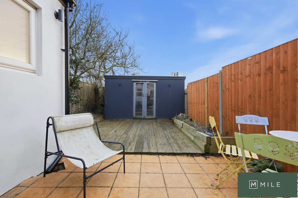 The apartment comprises two generous double bedrooms, an open-plan kitchen/living area, a modern bathroom, and a private south-facing garden. To the rear of the garden is a useful home office/studio/shed, ideal for remote working or additional storage.
