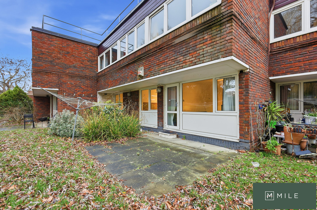 The accommodation comprises two generous double bedrooms, a modern bathroom, separate W/C, and a bright reception room with double doors opening directly onto the communal garden, creating an excellent sense of indoor-outdoor living. The contemporary kitchen is thoughtfully arranged with ample storage and workspace, ideal for everyday living.