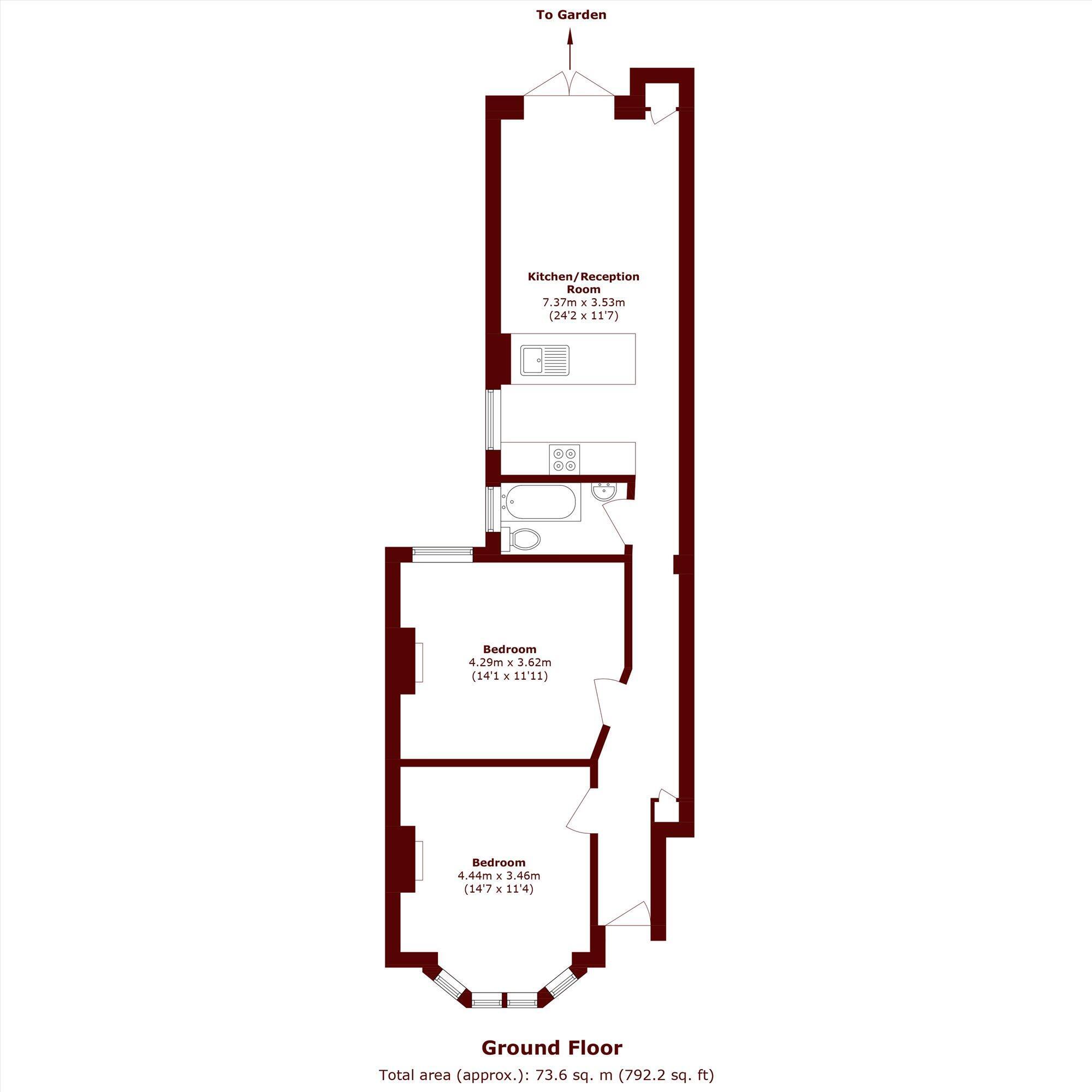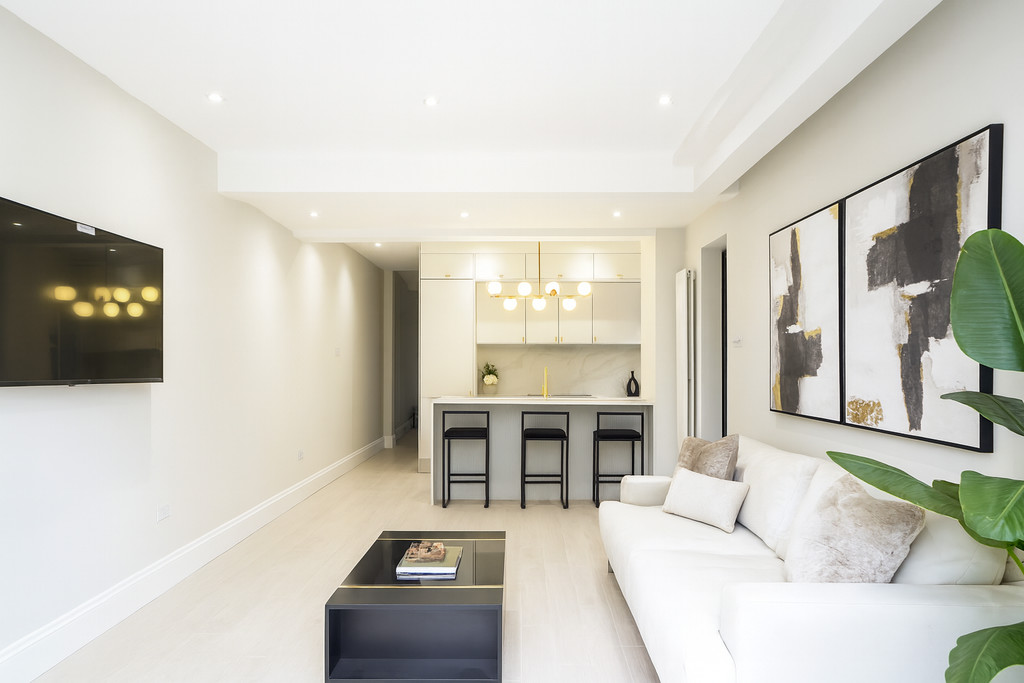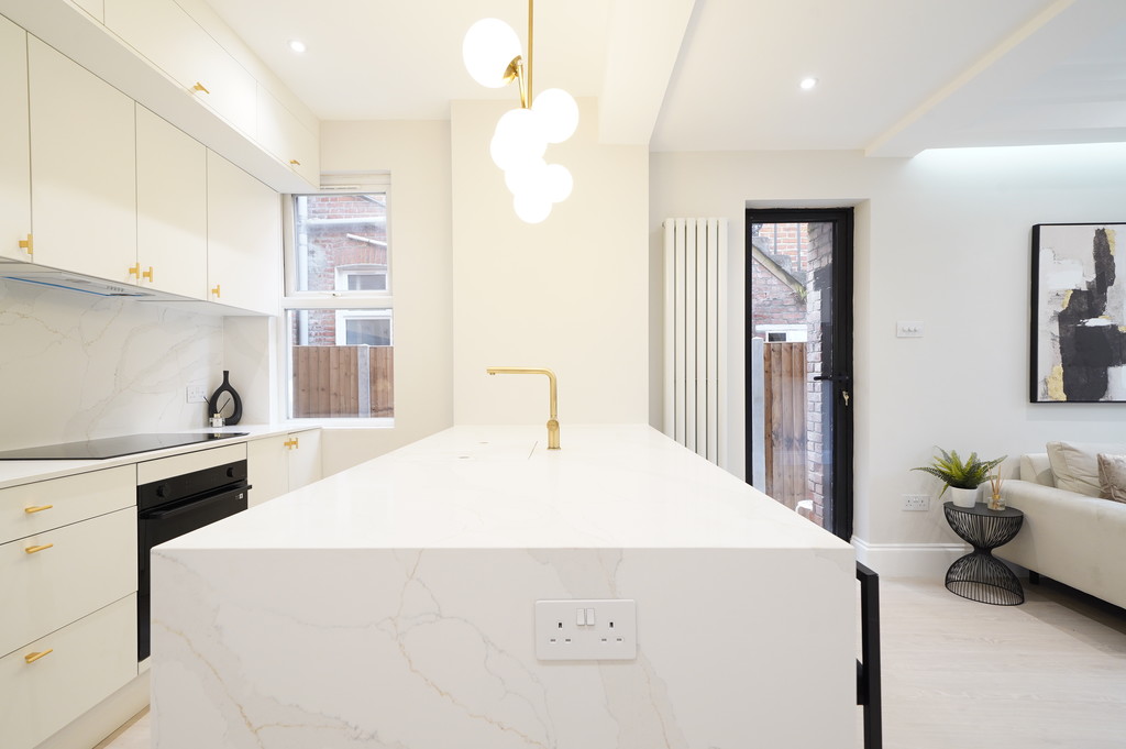 Accessed via its own private entrance, the property immediately impresses with its high ceilings, generous proportions and wooden flooring throughout, creating a bright and airy feel. The open-plan kitchen and reception space forms the centrepiece of the home, complete with Calacatta Gold quartz worktops, a stylish breakfast bar and ample room for both relaxing and dining - ideal for hosting friends or unwinding at the end of the day. Two well-proportioned bedrooms and direct access to the garden complete this superb home.